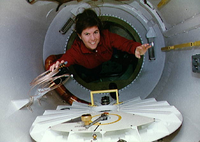 Janice Voss translates through the connecting tunnel between Endeavour's middeck and the Spacehab-1 module. Photo Credit: NASA