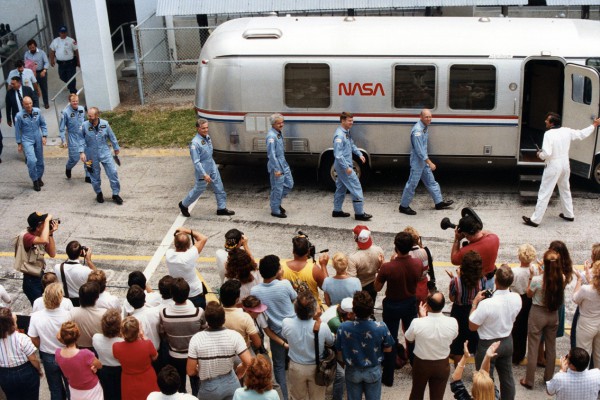 Commander Gordon Fullerton leads his crew out of the Operations & Checkout (O&C) Building on 29 July 1985, bound for Pad 39A and Challenger. Photo Credit: NASA